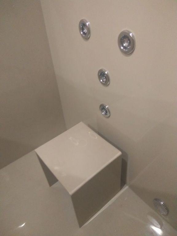 -Купель из полипропилена -Пластиковый наличник -Кольца для монтажа декоративной отделки - Гидромассаж 4 форсунки - Пластиковая переносная скамья |